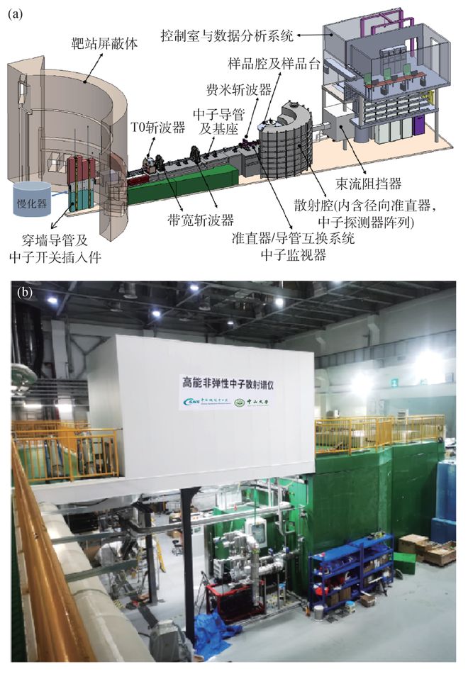 图2 (a)中山大学与中国散裂中子源联合建设的高能非弹谱仪结构模型示意图;(b)谱仪现场照片