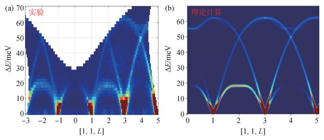 图3 (a)高能非弹谱仪实验测得的Si单晶的声子谱;(b)理论计算模拟Si标样的声子谱(感谢中国散裂中子源罗伟提供实验及理论模拟图片)